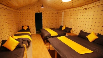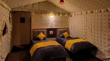 The resort features 15 well-appointed Swiss tents with a huge dining area, each tent is equipped with attached washrooms, offering a blend of comfort and rustic charm. In the evenings, guests can enjoy a delightful dining experience with a sumptuous dinner, complemented by a bonfire and soothing music, creating a warm and festive ambiance.